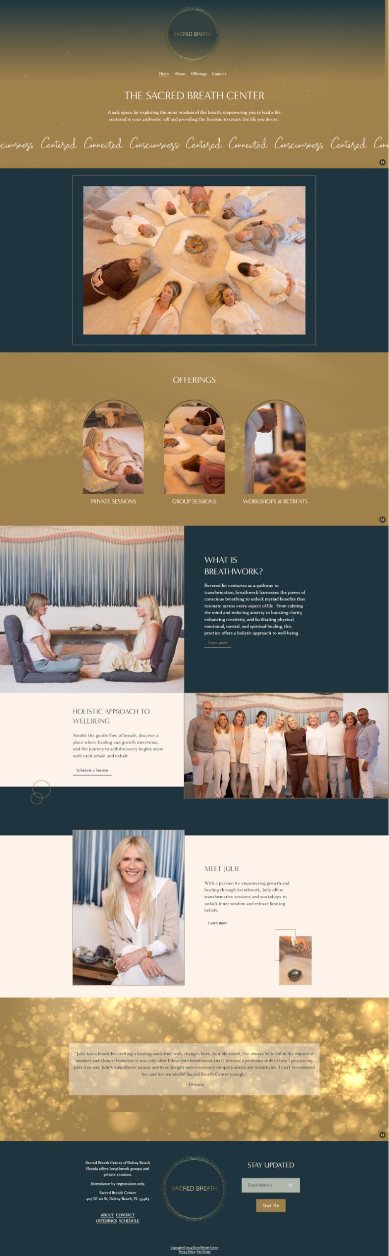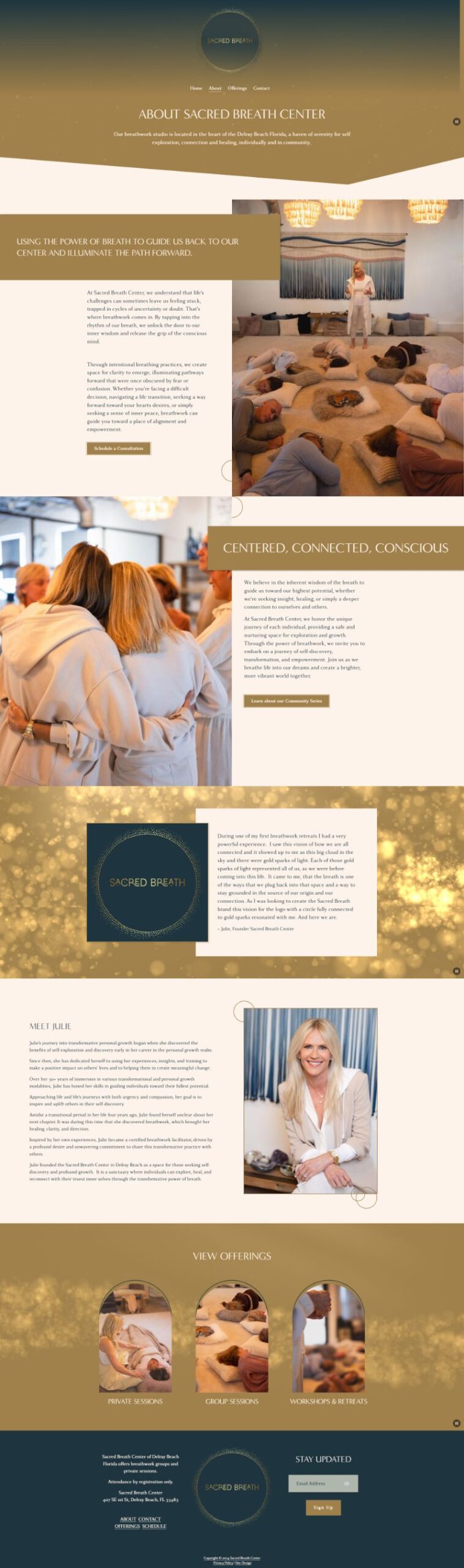 We built a Squarespace site for easy edits, plugged in Acuity for seamless bookings, and activated Squarespace Campaigns for newsletters—all under one login. Mood boards translated Julie’s “gold sparks” vision into motion graphics and a color palette that breathes on every page. A custom photoshoot captured real sessions, adding authenticity and warmth.